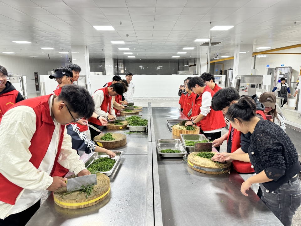 采完韭菜后,同学们兴致勃勃地回到食堂,开始了切韭菜的环节。洗净的韭菜在案板上,一把锋利的刀子,成为了大家合作的工具。在这个环节中,同学们分工明确,有的人负责切割,有的人负责清理,场面热闹非凡。