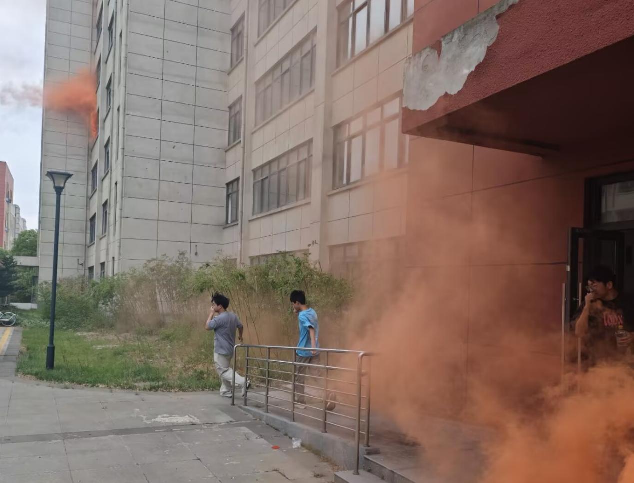 下午4点30分,随着烟雾弹启动、消防警报响起,演练环节正式启动。参演师生在工作人员指引下,沿疏散通道弯腰低姿、捂紧口鼻,有序撤离至指定安全区域。演练模拟真实火场环境,通过烟雾弹制造低能见度场景,检验师生在突发状况下的心理素质和协作能力。
