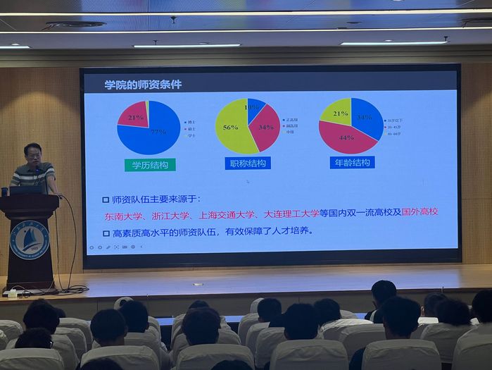 周道传老师在102报告厅为新生们系统介绍了土木工程专业的历史沿革和发展现状。他从专业办学历史讲起,详细阐述了土木工程专业自创办以来取得的显著成就。该专业现已建设成为国家一流专业建设点、江苏省品牌专业,并通过国家工程教育认证,办学水平和人才培养质量得到社会广泛认可。周老师重点介绍了专业设置的三个培养方向以及2023年获批设立的“茅以升班”创新人才培养模式。该班继承和发扬茅以升先生工程教育思想,致力于培养具有创新精神和社会责任感的卓越工程人才。