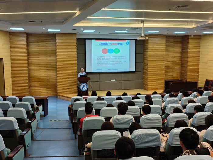 张友志老师在报告厅101为工程管理专业新生全面解读了专业特色和发展前景。他详细介绍了工程管理专业作为国家一流专业建设点的优势特色,强调该专业注重多学科交叉融合,在扎实的工程技术基础上,融合经济、管理、法律和信息技术等多学科知识,构建了独具特色的人才培养体系。专业办学水平得到行业高度认可,为员工成长成才提供了优质平台。