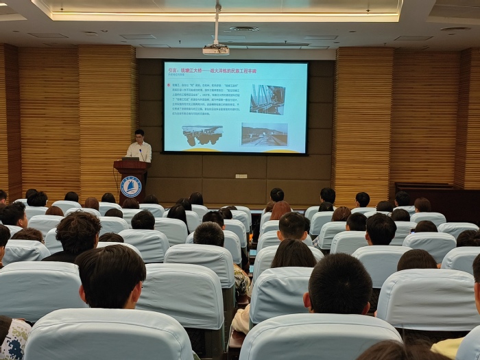 张浩馆长随后为新生们带来了精彩的讲述。他首先介绍了钱塘江大桥建设的时代背景与技术挑战。20世纪30年代,钱塘江因其水势凶猛、江底流沙厚达41米,被外国专家断言为“建桥禁区”,认为中国人不可能在此建桥。然而,怀抱“工程救国”志向的茅以升先生毅然受命,于1934年主持大桥设计与建造。面对艰巨挑战,茅以升及其团队创造性地运用了“射水法”、“沉箱法”、“浮运法”等先进技术,成功解决了80多个重大施工难题。经过925个日夜的艰苦奋战,1937年9月26日,钱塘江大桥铁路桥率先通车,这是第一座由中国人自行设计和主持建造的现代化公铁两用桥,它的建成彻底打破了外国人的技术垄断,极大地振奋了民族精神。